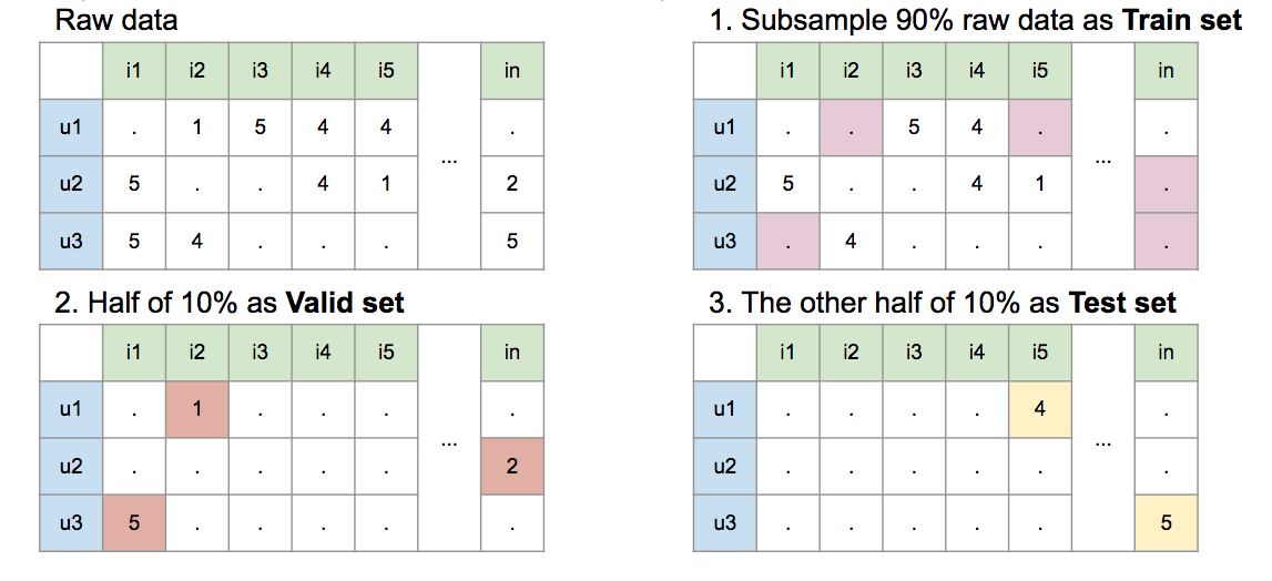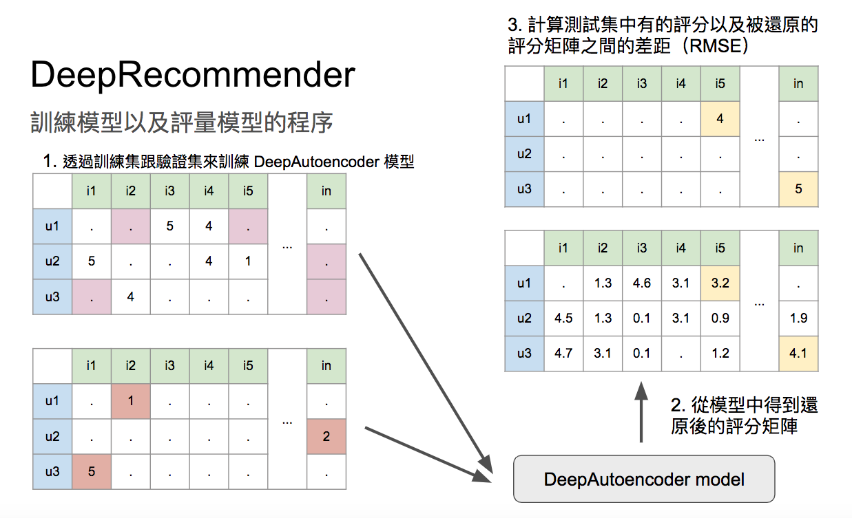 原始資料中會有用戶對不同項目的評分,DeepRecommender 會將這些評分切成 90% 部分為訓練資料用以訓練 DeepAutoencoder,5% 為驗證集,用以驗證訓練的 DeepAuencoder 之水準,剩餘 5% 為測試集,作為最後測試結果。