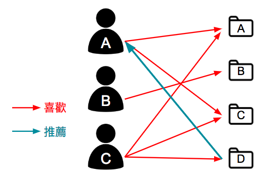 基於用戶協同過濾先尋找與目標用戶有相同喜好的鄰近用戶,然後根據目標用戶的鄰近用戶的喜好產生對目標用戶的推薦。基本原理就是利用用戶喜好行為的相似性來互相推薦用戶可能感興趣的項目,如下圖所示,用戶 A 喜歡項目 A 跟 C,用戶 B 喜歡項目 B ,用戶 C 喜歡項目 A、C 跟 D,從這些用戶的歷史偏好資訊中,我們可以發現用戶 A 跟用戶 C的偏好很類似,而用戶 C 還同時喜歡項目 D,那麼我們可以推斷用戶 A 也可能喜歡項目 D,因此將項目 D 推薦給用戶 A。