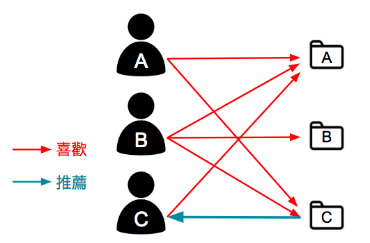 根據所有用戶對於項目的評價,發現項目彼此之間的相似度,然後根據目標用戶的歷史偏好資訊將類似的項目推薦給該用戶,如下圖所示,用戶 A 喜歡項目 B 跟 C,用戶 B 喜歡項目 A、B 跟 C,用戶 C 喜歡項目 A,從這些用戶的偏好資料中可以認為項目 A 跟項目 C 比較類似,喜歡項目 A 的都會喜歡項目 C,基於這個案段用戶 C 也可能喜歡項目 C,所以推薦項目 C 給用戶 C。