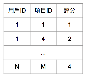功能:將N個用戶對於M個項目評分的歷史資料整理成以下資料表形式,而用戶對於項目列表至少給予一筆以上的評分。透過歷史評分資料,推薦系統會將資料轉換成 N * M 的評分矩陣,再去學習用戶跟項目之間的連結關係。後續預測時,您可以輸入一名新用戶對於多筆不同項目的評分,系統將會推薦給適合的項目給這位新用戶。