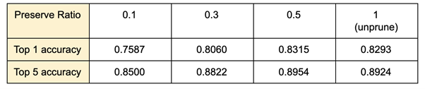 由上表可以看出在使用 Channel Pruning 的情況下,保留的參數量在 50% 以上時,可以維持與原始模型接近的準確度。