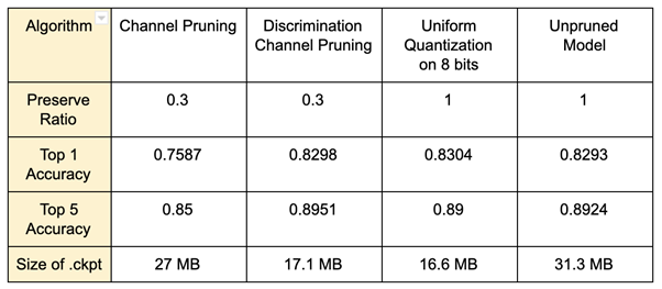 為了探討不同壓縮方法在相同壓縮比率下的表現,我們比較了 Channel Pruning、Discrimination-aware Channel Pruning 在保留 3 成的權重,Uniform Quantization 在 8 bit 的情況下的準確度與模型檔案大小。