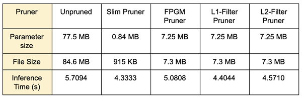 由於 PocketFlow 目前只能做到「找出不重要的參數」並且加上遮罩,使這些參數不會在運算時被使用,卻不能真正的修改模型結構,將這些參數從模型中真正的移除。而 NNI 開發了一個基於 pytorch 框架,用於刪除這些被遮罩住的參數的工具,所以我們在 NNI 的測試項目主要在於刪除參數功能的部分。