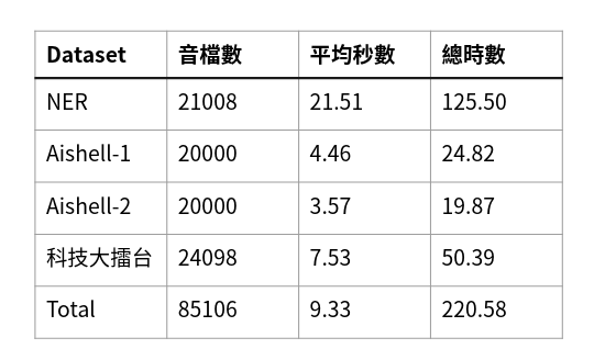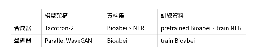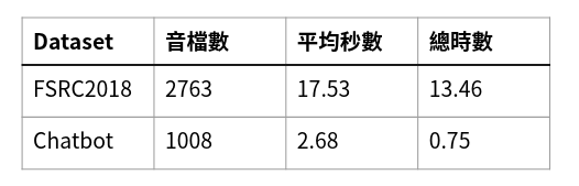 另一個測試集為自行錄製的音檔,三位語者,約0.75小時,共1008筆音檔。測試集文本內容 為中山無人書店聊天機器人中使用者常用的語句 (如表3)。